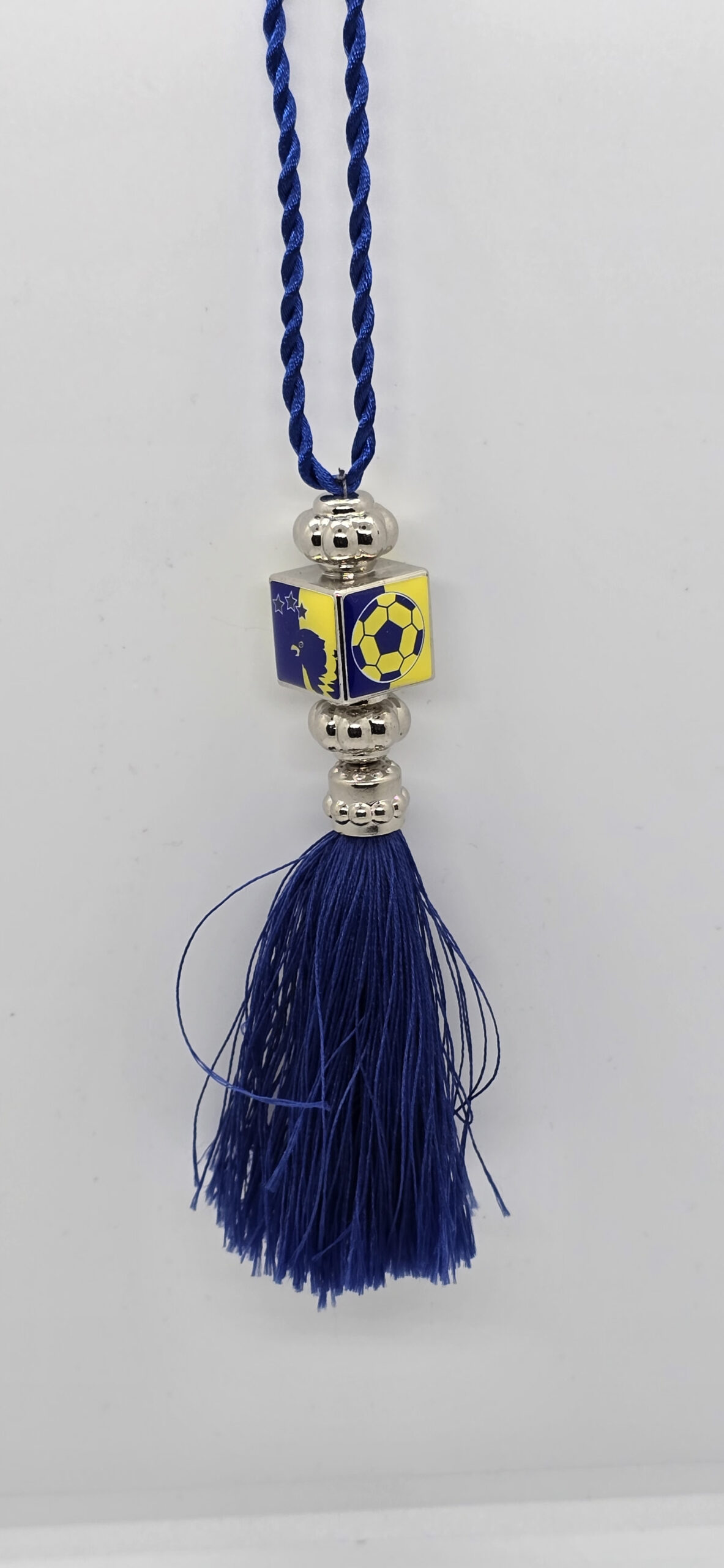 Aracınızın iç mekanına enerjik ve sportif bir hava katmak için tasarlanan lacivert sarı temalı ayna süsü, dikkat çekici görünümüyle öne çıkar. Canlı mavi püskül detayı ve metalik boncuk tasarımı sayesinde modern bir görünüm sunar. Dikiz aynasına kolayca asılabilen yapısı ile pratik kullanım sağlar.
